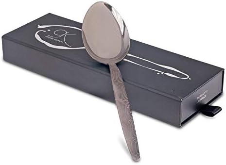 Gray Kunz Spoon – Special Edition – Damascus PatternMany culinary tasks such as mixing require something larger than the standard sauce spoon. However a typical kitchen spoon is too large for finesse jobs like saucing. Enter Chef Gray Kunz nominated “Best American Chef” by the James Beard Foundation and awarded four stars from the New York Times. Twenty-three years ago during his reign as head chef at the legendary Lespinasse restaurant in New York City he designed the now-iconic version that bears his name. Fast forward to the present day; the Gray Kunz spoon has absolutely become de rigueur in the kitchens of high-end restaurants all over the world. A professional chef knows that a good spoon is essential and uses a spoon for everything from basting to flipping meat to delicate operations like forming quenelles. Being able to do so much with one tool saves an enormous amount of time and effort in the kitchen; consequently having a good spoon at one’s disposal is crucial.This special limited edition Kunz spoon is made from heavy-duty 18/10 stainless steel with a permanently electroplated Black PVD finish (it is dishwasher safe). It is 9” long and holds 2.5 tablespoons (about 40 ml)—the ideal amount for saucing the main course. Its delicate silhouette gives it an air of elegance and yet it’s extremely durable. The bowl of the spoon is large enough that it can be used to flip steaks and seafood in the pan with a gently tapered edge that allows greater precision in pouring.In addition the spoon’s shorter narrower handle balances its weight so that it rests comfortably between the thumb and index finger.This Special Limited Edition of the Gray Kunz spoon combined with its specially-designed presentation box will be available only as long as supplies last.